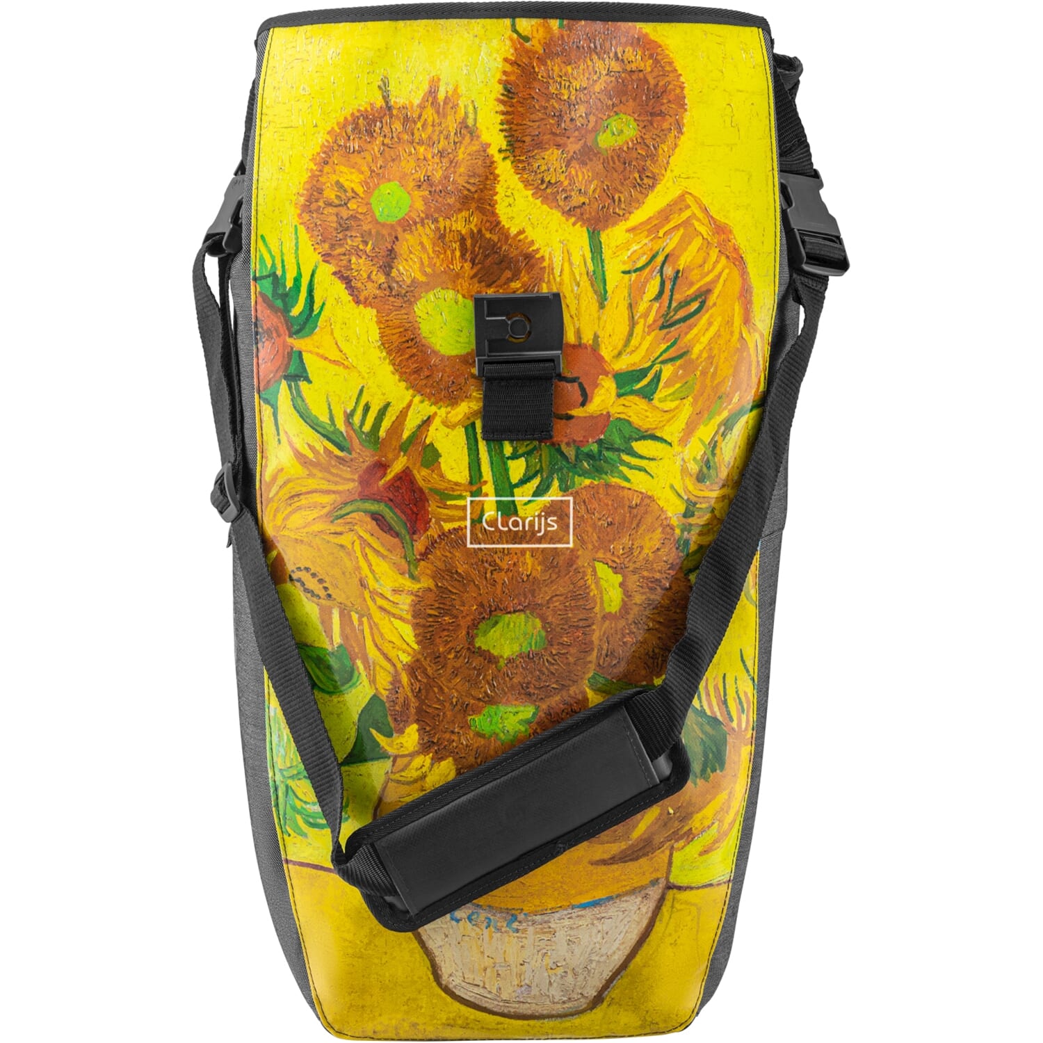 De Clarijs Solobag Van Gogh sunflowers is enorm geschikt als fietstas. Deze draagbare fietstas kan zowel links als rechts aan uw fiets worden bevestigd. De tas ismet uitzondering van de haken en gespen volledig gerecycled! Clarijs recyclet PVC en gecoat acryl door de waste en cut-outs van de Clarijs bakfiets tentjes te gebruiken die worden geproduceerd voor Urban Arrow, Babboe, Carqon, Johnny loco en Butchers & Bicycles.De Solobags in het kort: multifunctionele100%waterdichteenkele fietstas, Klickfix-systeem: zonder gereedschap te verstellen, Je haalt de tas eenvoudig uit de bagagedrager: als je aan de hendel trekt die gekoppeld is aan het kliksysteem, klikken de haken los van de bagagedrager buis , de tas sluit gemakkelijk metmagnetischeFIDLOCK gesp, ook geschikt als schoudertas dankzij eenmeegeleverde afneembare schouderriem, veel inhoud in een enkele fietstas(24 liter!) en verstevigde tas metruim hoofdvak. Buitenafmetingen van deze enkele fietstas:Breedte 31 cm, hoogte 40 cm en diepte 19 cm. De haken passen op bagagedragers met een buisdiameter tot 22 mm.