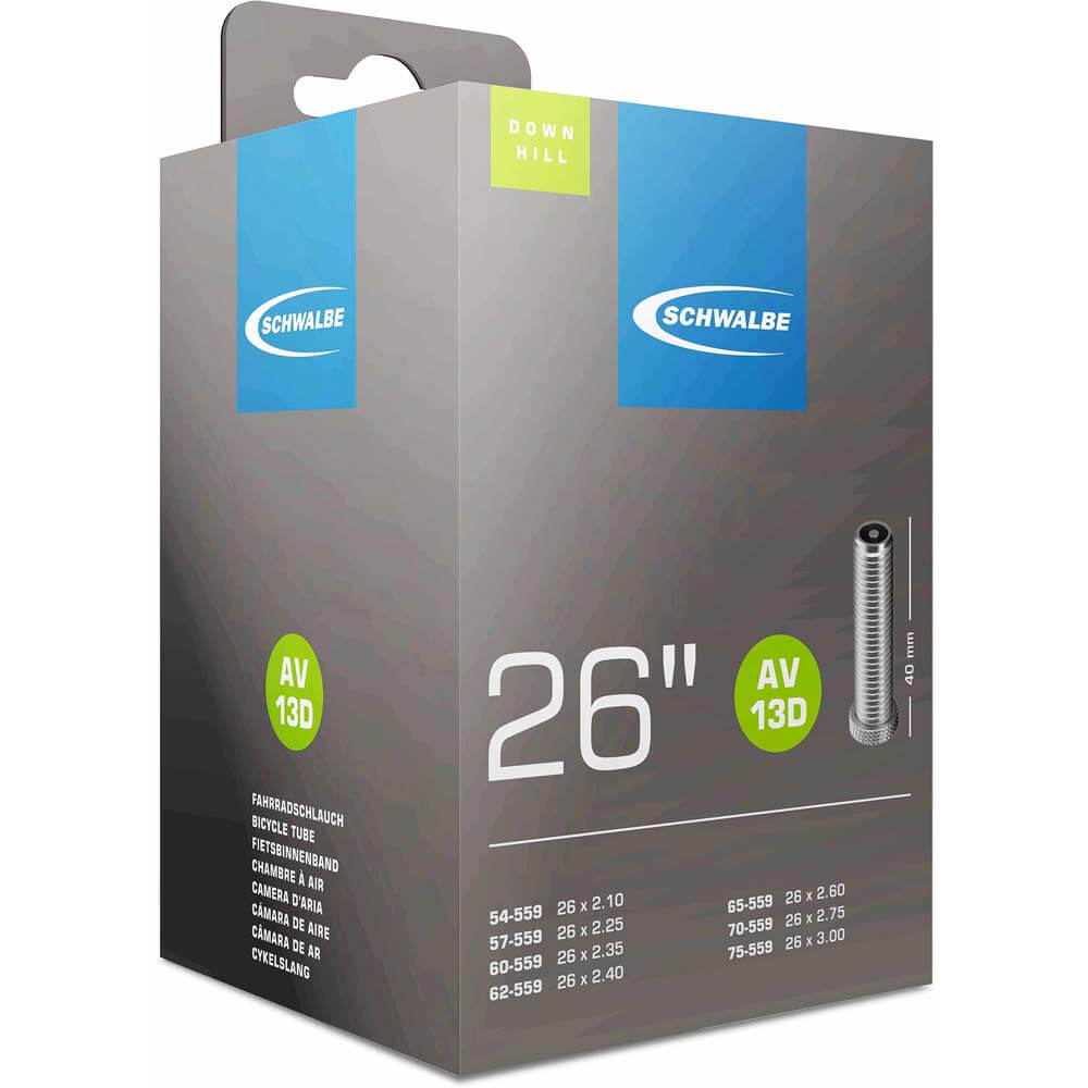 Schwalbe binnenband Breed Downhill 26 Inch Auto – AV13D/54-559, 57-559, 60-559, 62-559-65-559, 70-559, 75-559. De Schwalbe binnenbanden zijn betrouwbaar. Fietsdetaillisten waarderen hem om zijn hoge betrouwbaarheid. Iedere band wordt in de fabriek opgepompt en zo 24 uur op luchtdichtheid getest. De band houdt de luchtdruk langer vast. In de productie vereist Schwalbe een zeer hoog butyl aandeel en een zeer hoge reinheid van het materiaal. Zo houdt de Schwalbe binnenband de luchtdruk beduidend langer vast dan andere binnenbanden. Het is een groepen-binnenbandsysteem: Een Schwalbe binnenband is extreem elastisch en past op meerdere bandafmetingen. Hierdoor worden ze groepen binnenbanden genoemd. Zo past bijvoorbeeld de binnenband met nummer 19A voor bandafmeting van 27.5 inch tot 29 Inch en voor de breedte van 40 tot 62mm. Als laatste is de band 100% volledig recyclebaar. Downhill-uitvoering: Extreem robuust, met versterkte ventielvoet.